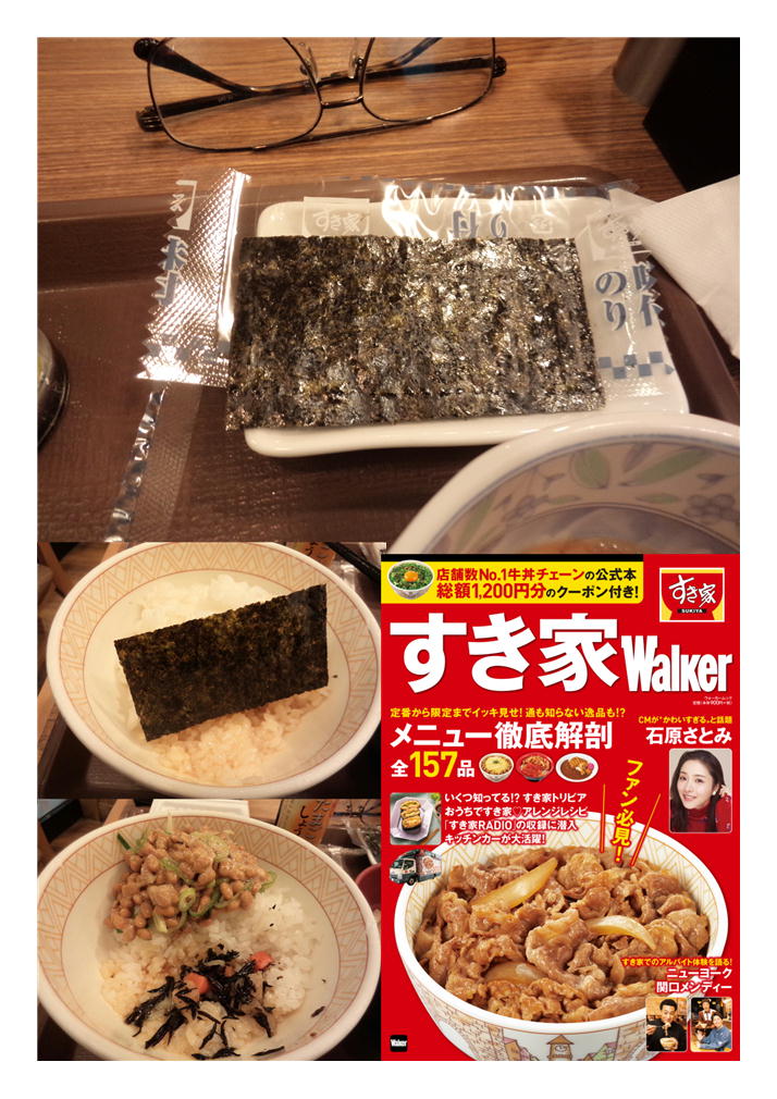 最初の御飯は、生卵出食べる。何かそれがほっとする。濃い味のひじきの小鉢が、卵御飯と良く合う。いや美味しい。後半戦は、納豆の出番。海苔(すき家は3枚しか入っていないのが残念)の出番。熱い御飯に納豆は、私の大好物。いろいろ楽しめる朝食となった。満腹御礼。