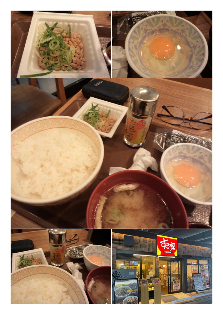 朝食は外食(御徒町)。すき家で朝食定食、「卵・納豆定食」。