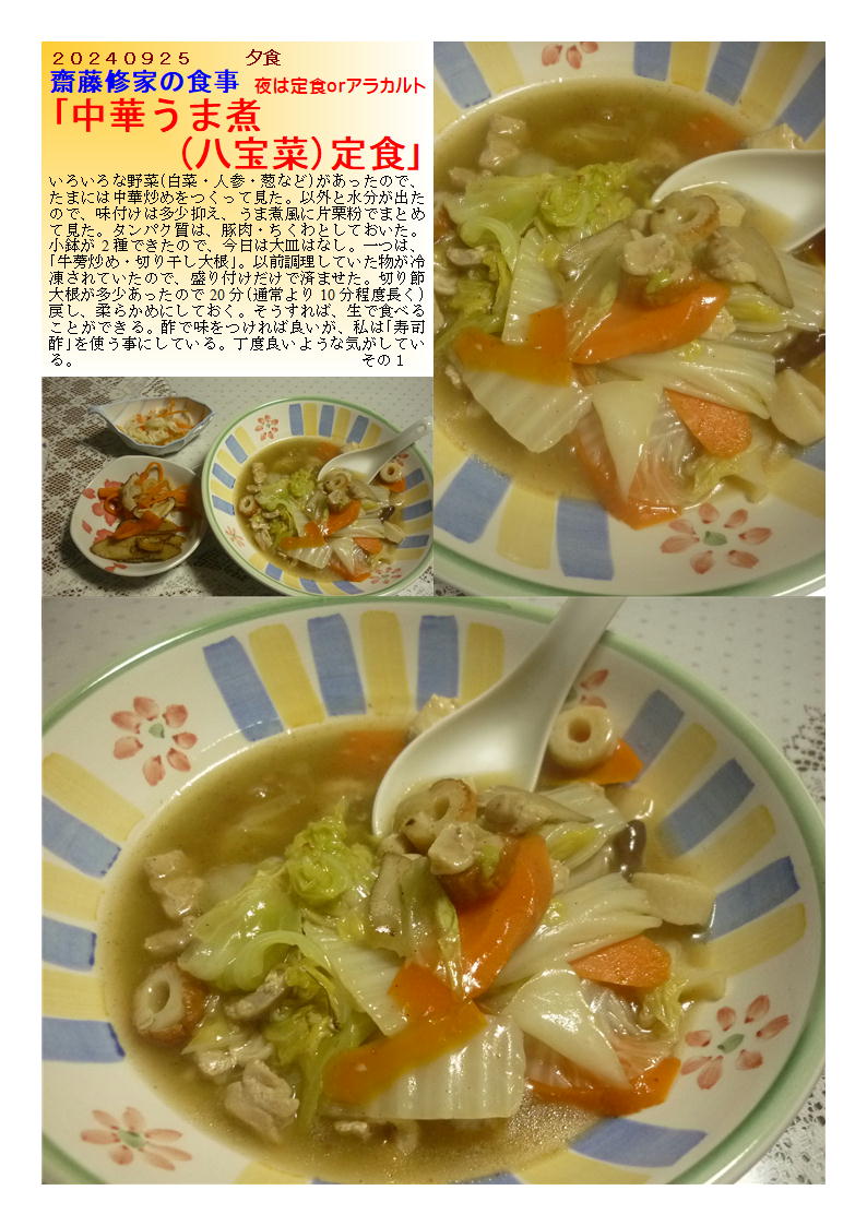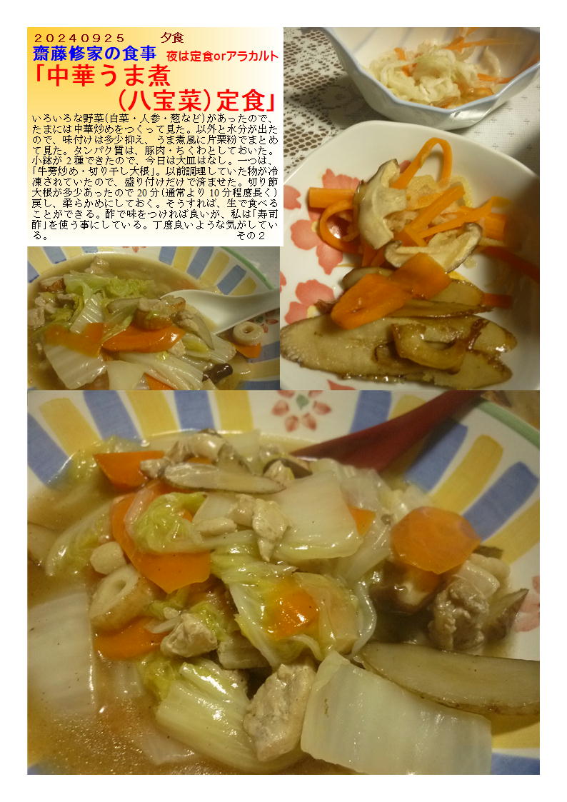 いろいろな野菜(白菜・人参・葱など)があったので、たまには中華炒めをつくって見た。以外と水分が出たので、味付けは多少抑え、うま煮風に片栗粉でまとめて見た。タンパク質は、豚肉・ちくわとしておいた。小鉢が2種できたので、今日は大皿はなし。一つは、「牛蒡炒め・切り干し大根」。以前調理していた物が冷凍されていたので、盛り付けだけで済ませた。切り節大根が多少あったので20分(通常より10分程度長く)戻し、柔らかめにしておく。そうすれば、生で食べることができる。酢で味をつければ良いが、私は「寿司酢」を使う事にしている。丁度良いような気がしている。
