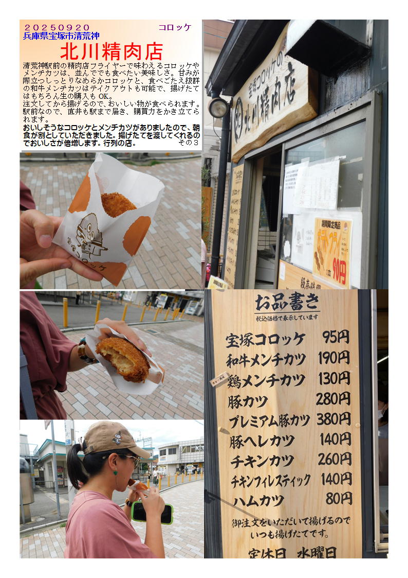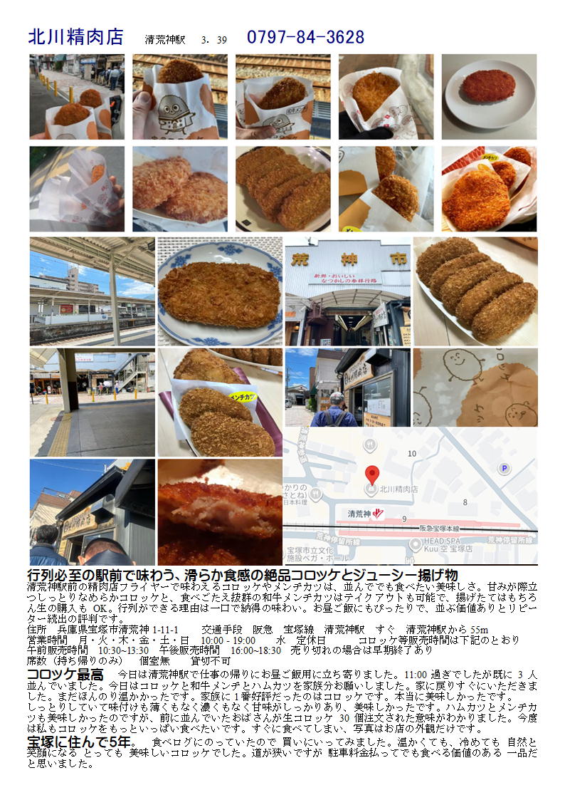 北川精肉店 20250920 2025年12月05日 09:09 お問い合わせは、sosamu@ya2.so-net.ne.jp までお願いします。中華街で知りたいこと、紹介してほしいこと等あれば ご連絡ください。sosamu@ya2.so-net.ne.jp 中華街を好きになってくれる人が増えることを願っています。 中華街は、中華街の魅力を、最近の中華街は中年おじさんの散策part2-ご覧ください。私のもう一つの趣味、山登り(過去の記録をまとめています)。山好きおじさんの部屋 もご覧ください。20250920 コロッケ兵庫県宝塚市清荒神 北川精肉店清荒神駅前の精肉店フライヤーで味わえるコロッケやメンチカツは、並んででも食べたい美味しさ。甘みが際立つしっとりなめらかコロッケと、食べごたえ抜群の和牛メンチカツはテイクアウトも可能で、揚げたてはもちろん生の購入もOK。注文してから揚げるので、おいしい物が食べられます。駅前なので、直井も駅まで届き、購買力をかき立てられます。おいしそうなコロッケとメンチカツがありましたので、朝食が割としていただきました。揚げたてを渡してくれるのでおいしさが倍増します。行列の店。 「外食」カテゴリの最新記事 < 前の記事次の記事 > コメント コメントフォーム 名前 コメント 記事の評価 リセット リセット 顔 星 情報を記憶 コメントを投稿する