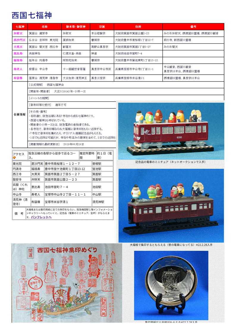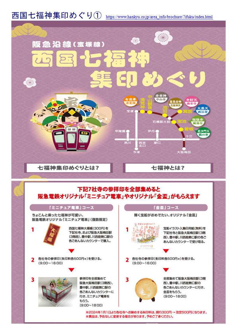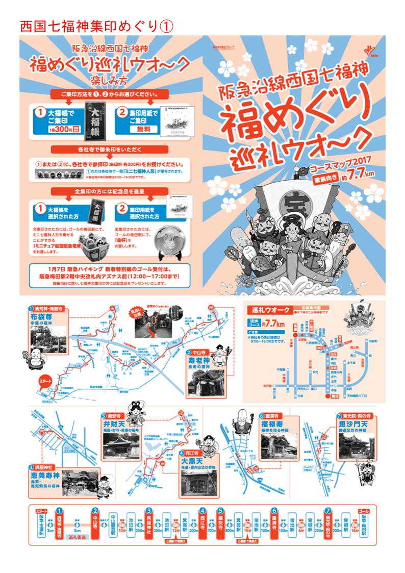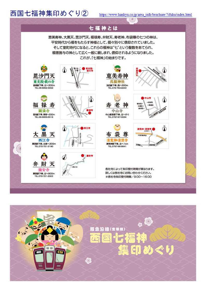 清荒神清澄寺(布袋尊)→中山寺(寿老神)→呉服神社(恵比寿神)→箕面山瀧安寺(弁財天)→西江寺(大黒天)→圓満寺(福禄寿)→「萩の寺」東光院(毘沙門天)